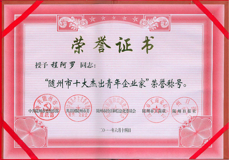 2011隨州市十大杰出青年企業(yè)家證書 |
