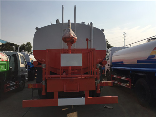 灑水車噴水出口: 前沖,后灑,后工作臺高炮,前沖(噴)后灑、帶側(cè)噴(花灑)、帶后工作平臺、平臺上安裝綠化灑水高炮(炮有大雨、中雨、毛毛雨、霧狀可調(diào)節(jié)),帶吸水管,帶消防接頭