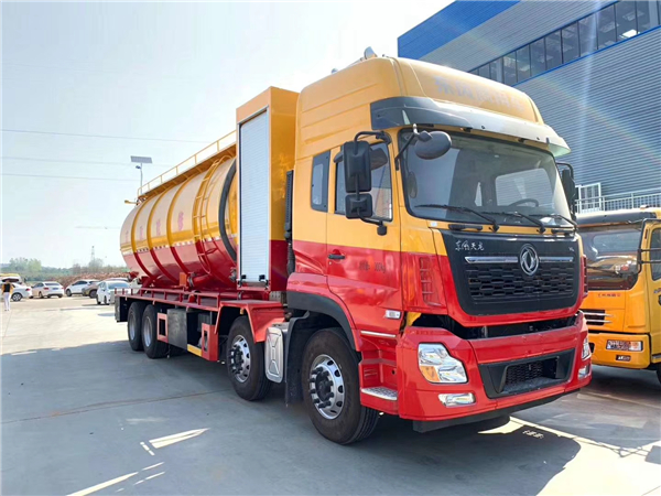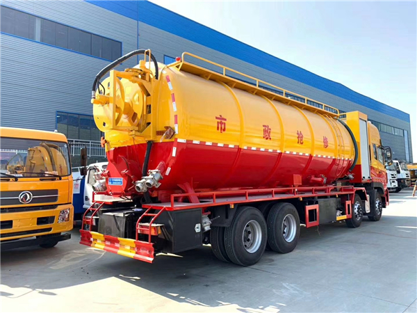 高壓清洗吸污車罐體兩側(cè)中部設(shè)有走臺箱,平時用于擱置吸污膠管,維修時站立。罐體內(nèi)部裝有防蕩板,用以減少高壓清洗吸污車行駛所引起的液體的劇烈晃蕩沖擊對罐體及其車架連接部位損壞。前封頭設(shè)有觀察量管,便于監(jiān)視裝載量,防止超載。底部設(shè)有清洗孔,平時密封著,清洗罐體時,可打開清洗孔蓋,讓污水自流排出。