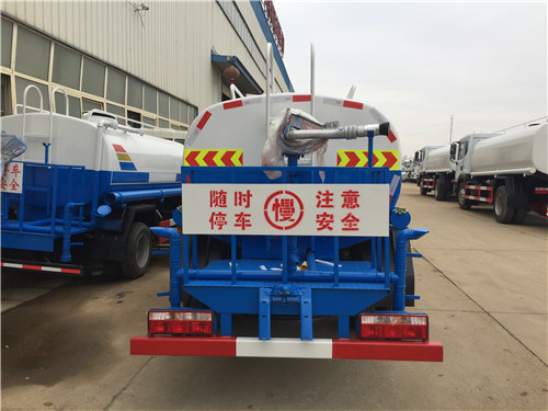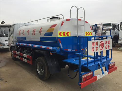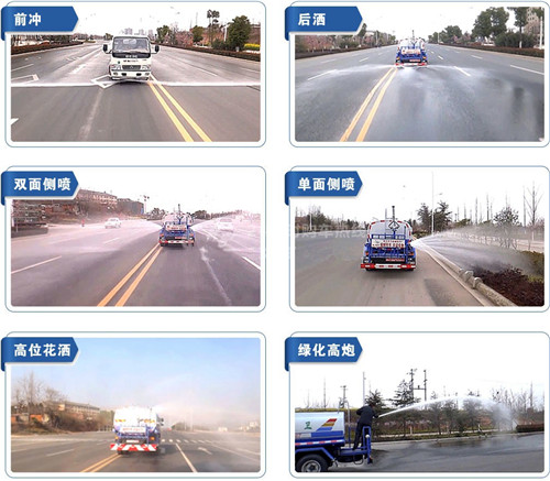 灑水車(chē)的基本配置:罐體用4MM碳鋼板制作,罐內(nèi)隔板具有防波作用,以減低灑水車(chē)行駛時(shí)罐體液體的沖擊。整車(chē)帶一個(gè)專用灑水泵(垂直最大吸程6米),灑水寬度14米,射程28米。灑水車(chē)配備2個(gè)前沖(噴)(能將路面泥巴、塵土、垃圾沖干凈);2個(gè)后灑(能均勻地將水灑在路面,一次灑水寬度14米)、2個(gè)側(cè)噴(花灑)(能均勻地將路旁綠化帶澆灌)、帶1個(gè)后工作平臺(tái),平臺(tái)上安裝1個(gè)綠化灑水高炮(灑水炮可全方位旋轉(zhuǎn),可連續(xù)調(diào)成直沖狀、大雨、小雨、毛毛雨,霧狀可調(diào)節(jié)沖洗高大樹(shù)木),引水時(shí)間<5min,流量90m3/h。帶1個(gè)消防接頭,帶1個(gè)自流閥,1個(gè)過(guò)濾裝置、人性化爬梯及側(cè)防護(hù)欄,安裝灑水音樂(lè)喇叭。