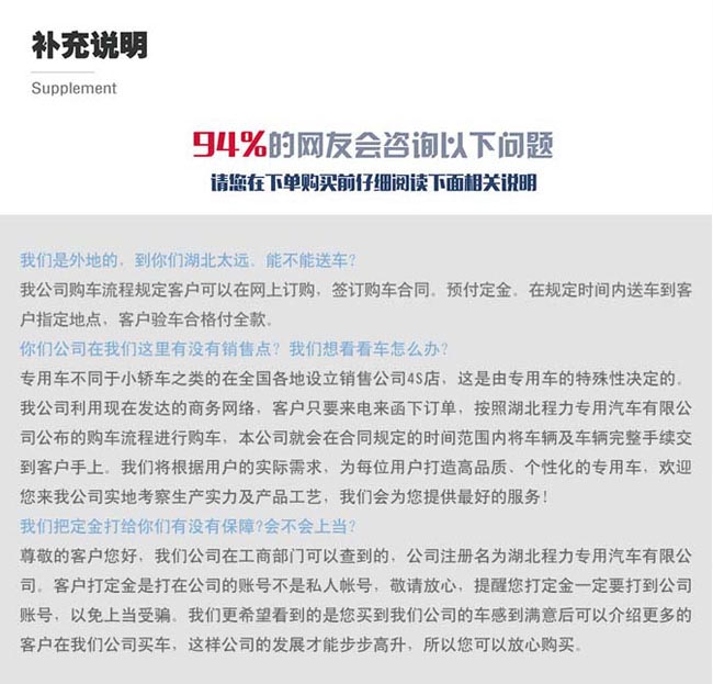 專用汽車行業(yè)資質(zhì)最全、品類最多的企業(yè) 完善的質(zhì)量管理體系 廠家直銷,沒(méi)有中間商 購(gòu)車流程 國(guó)家標(biāo)準(zhǔn)售后服務(wù)五星級(jí) 廠家直銷服務(wù)熱線